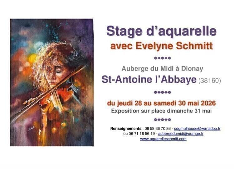 Stage d'aquarelle au sein de l'auberge du midi à Dionay. Exposition des travaux des stagiaires prévu le lendemain de la fin du stage. S'adresse aux personnes de tous les niveaux : débutants ou confirmés.