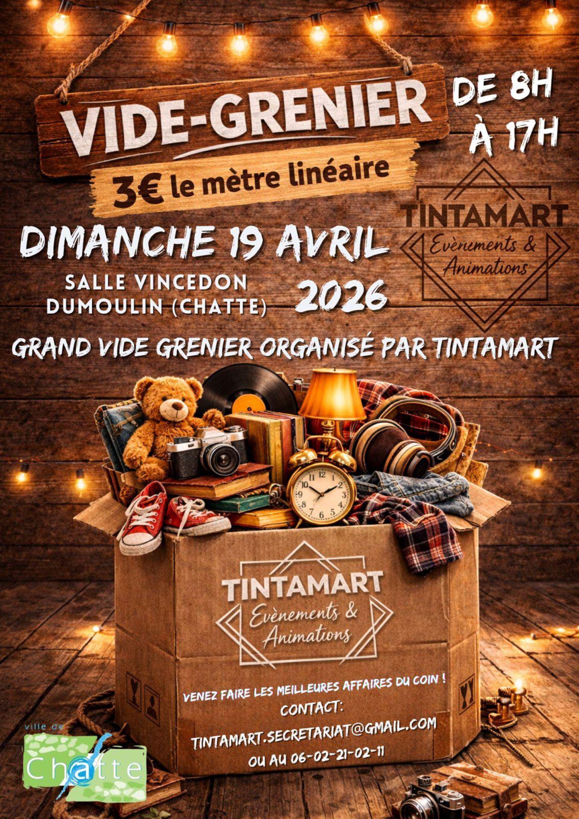 Grand vide-grenier organisé par Tintamart. Venez faire les meilleures affaires du coin ! 3€ le mètre linéaire